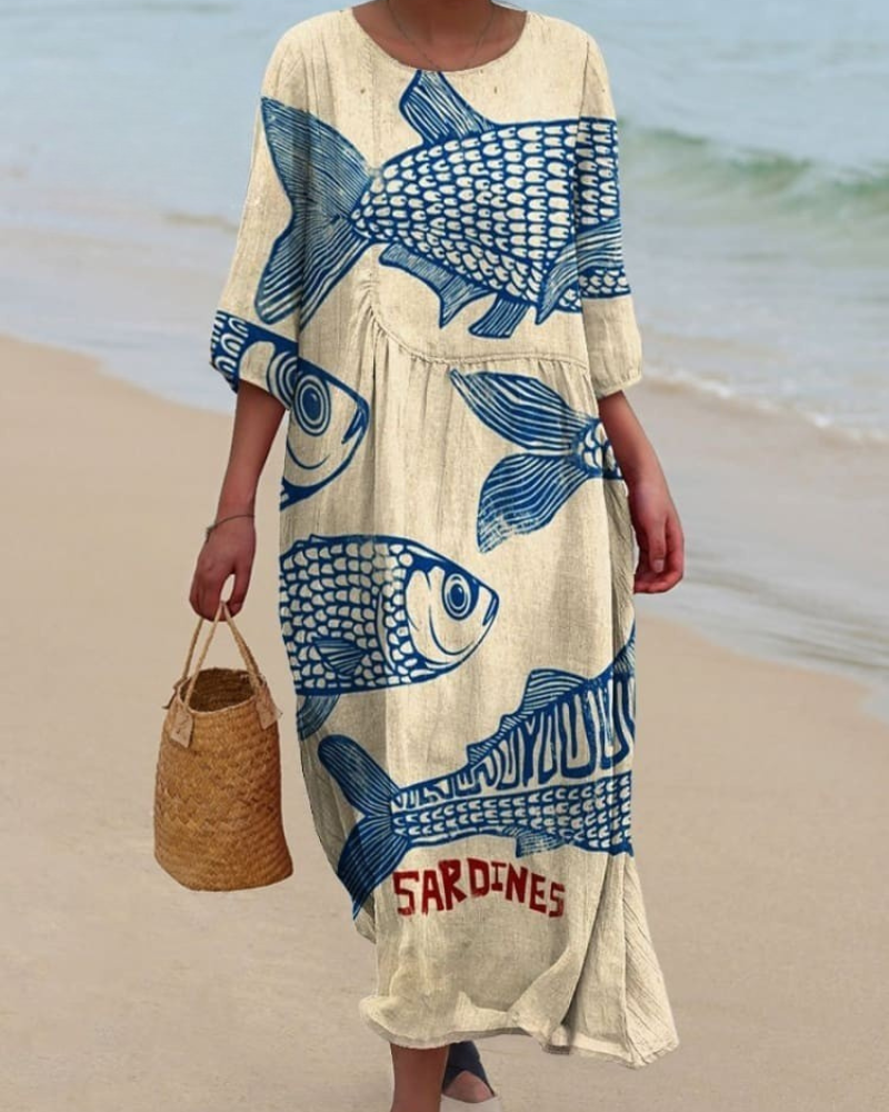 Ines - Women's Vintage Fish Sardines V-Neck Flowy Dress