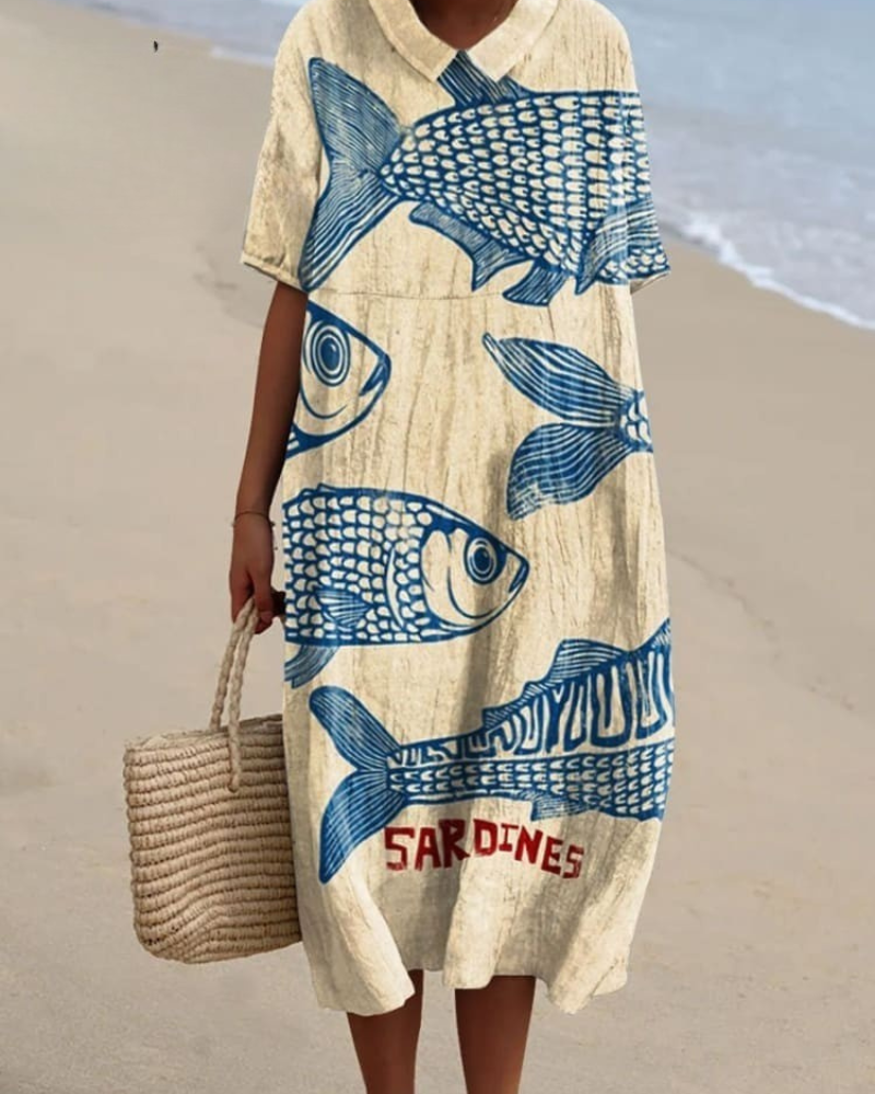 Bring a touch of whimsy and charm to your wardrobe with the Ines Vintage Fish Sardines V-Neck Flowy Dress. Featuring a delightfully quirky sardine motif inspired by classic coastal illustrations, this dress blends nostalgia with contemporary comfort. Whether you're dressing this piece tells a story of creativity, ease, and effortless expression.
